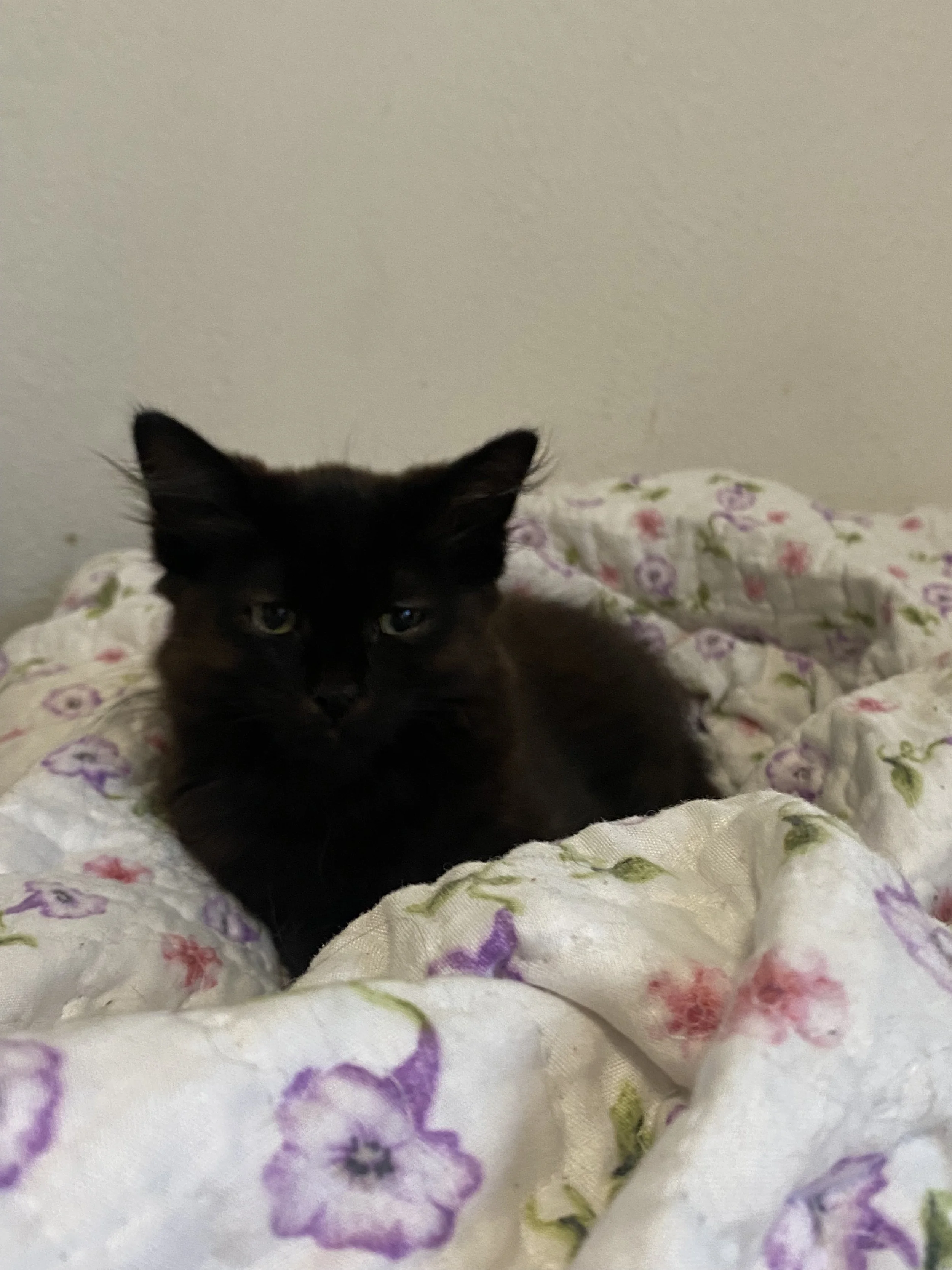 Found outdoors at just about two months old, Minnie May is a very sweet, fully litter box trained 7-8 month kitten ready to meet her forever home. Minnie is an affectionate girl who loves pets and brushing. Shy at first, once Minnie May warms up to someone she will purr and continue to ask for pets. With that striking coat, she will be a lovely addition to any family.